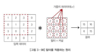 - 합성곱 계층을 구성하는 원리는 'y=wx+b'의 식과 같이 원 이미지의 각 픽셀을 x로 보고, 필터 w값을 곱해 y값을 구함