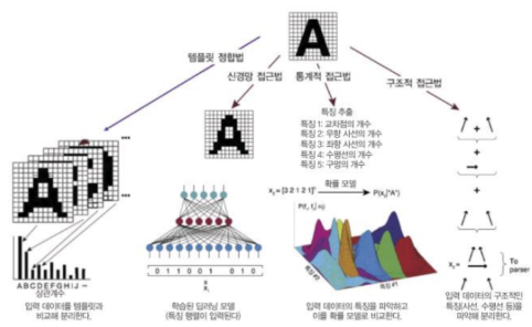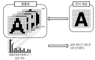- 비교 대상 패턴에 대한 템플릿을 미리 마련해 두고, 인식하고자 하는 패턴을 템플릿 구성 조건에 맞추는 정규화 과정을 거쳐 상호 관계나 상호 거리와 같은 유사도를 척도로 해 패턴을 인식하는 방법