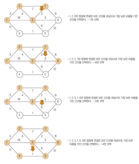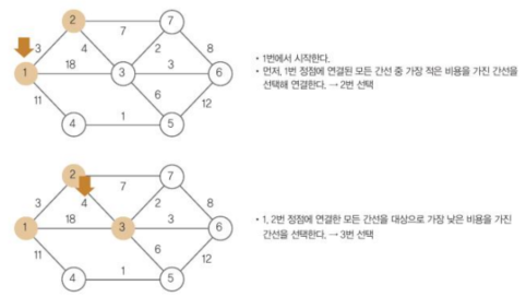 - 주어진 네트워크에서 무조건 최솟값을 갖는 간선만을 선택하는 방법