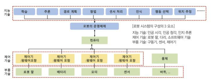 - 지능 기술: 인공 시각, 인공 청각, 인지 추론을 포함하는 개념으로, 로봇의 운영 체제에서 제공