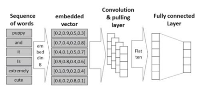 - 단어의 시퀀스로부터 워드 임베딩을 이용해 각 문서에 대해 2차원 행렬로 변환하고, 컨볼루션과 풀링의 반복을 통해 요약 정보를 추출한 다음, 완전 연결 계층으로 구성된 분류기를 적용해 문서를 판별