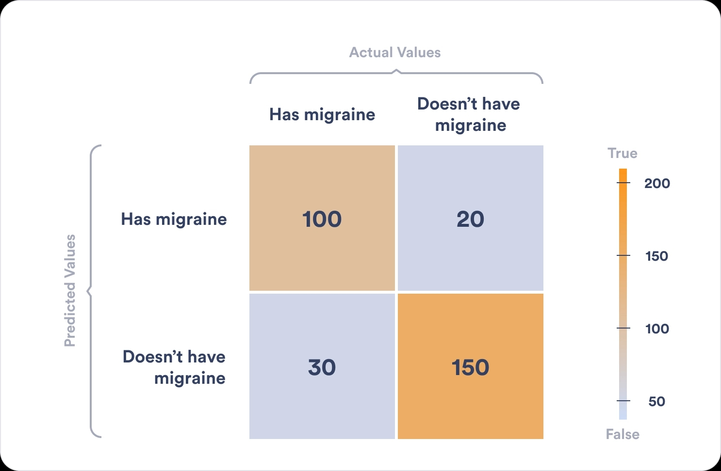 혼동 행렬과 그 값을 더 잘 이해하기 위해 다음 예제를 고려해 보겠습니다. 편두통으로 고통 받는 환자의 수를 예측할 수 있는 모형을 만들고 싶다고 가정해보겠습니다.