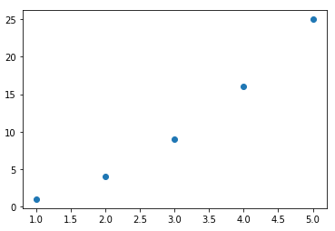 plt.scatter([1, 2, 3, 4, 5], [1, 4, 9, 16, 25])
